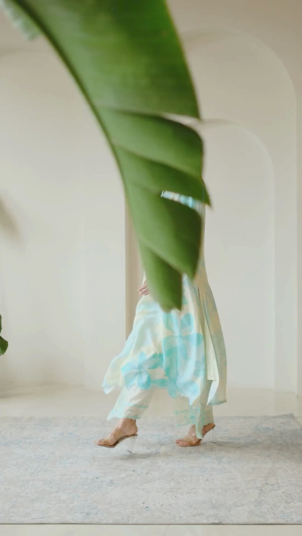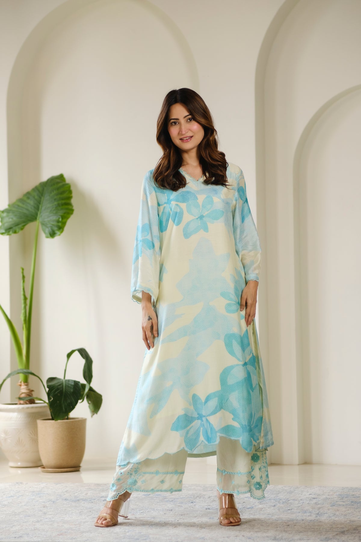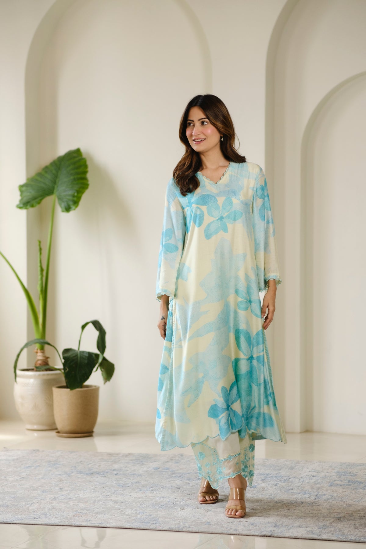 Aqua Blue Cut Work Scallope Muslin Kurta with Organza Border Embroidered Scallope Pant Set