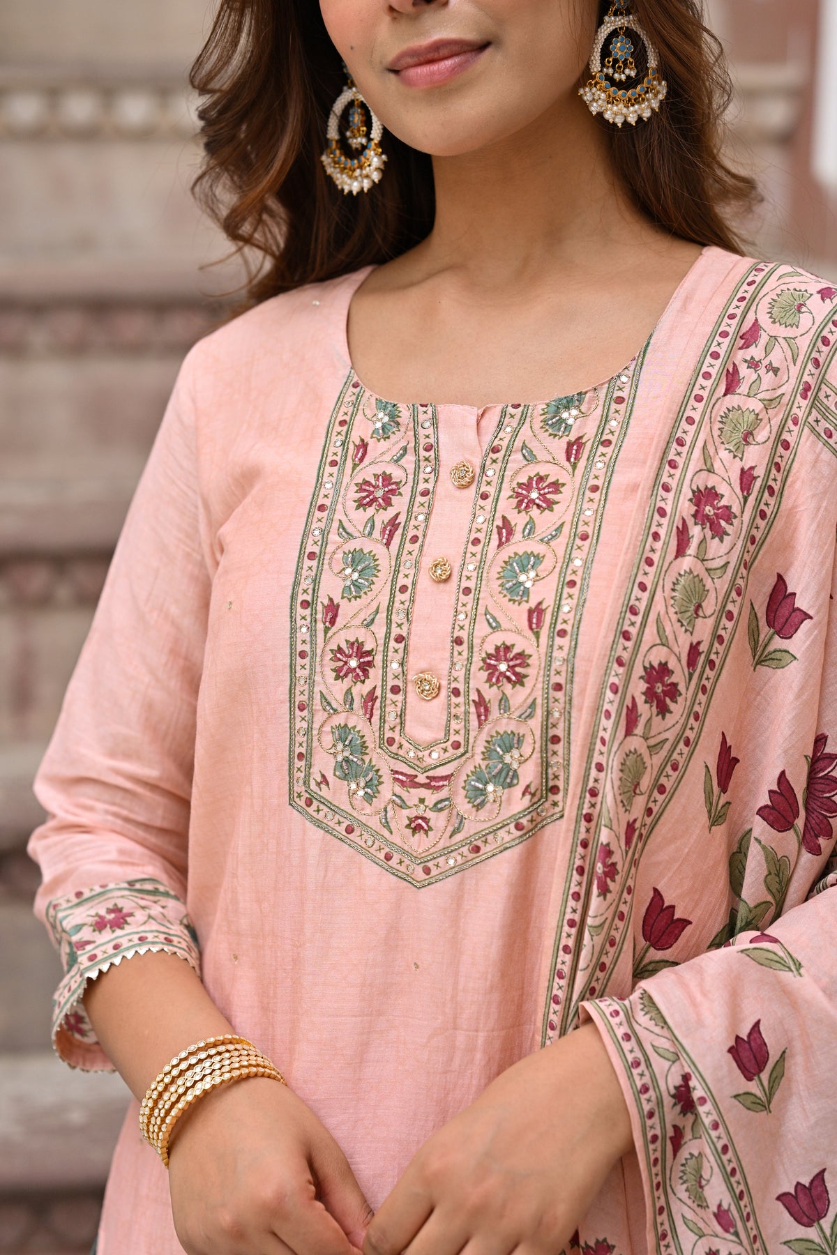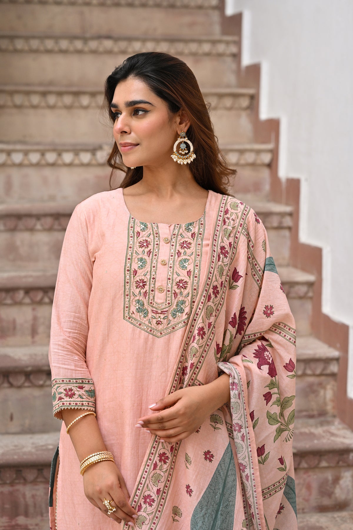 Peach Block Mughal Print Mul Chanderi Suit Set