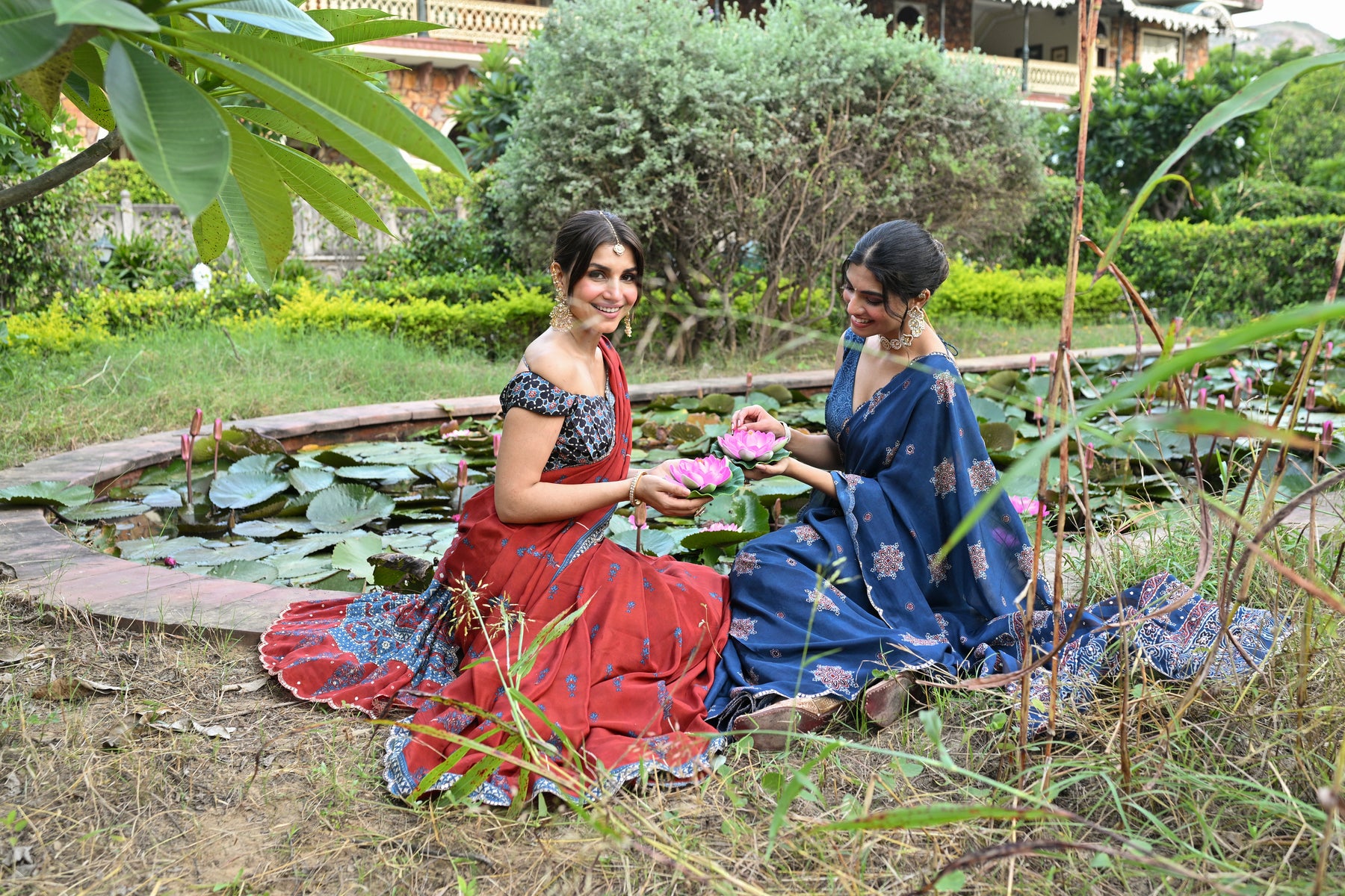 Red Mughal with Ajrakh Print Saree with Mirror , Sequence and Aari Work and Scallope Border