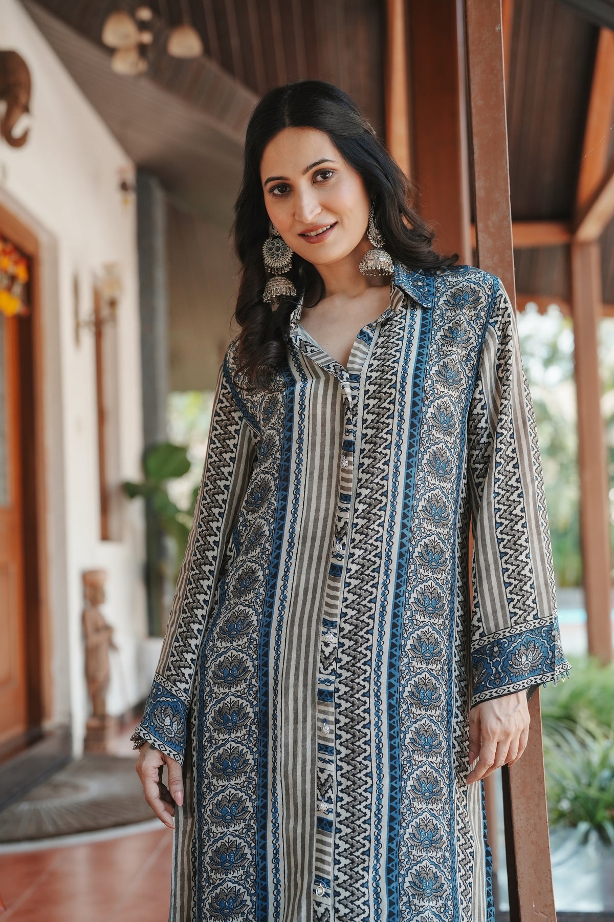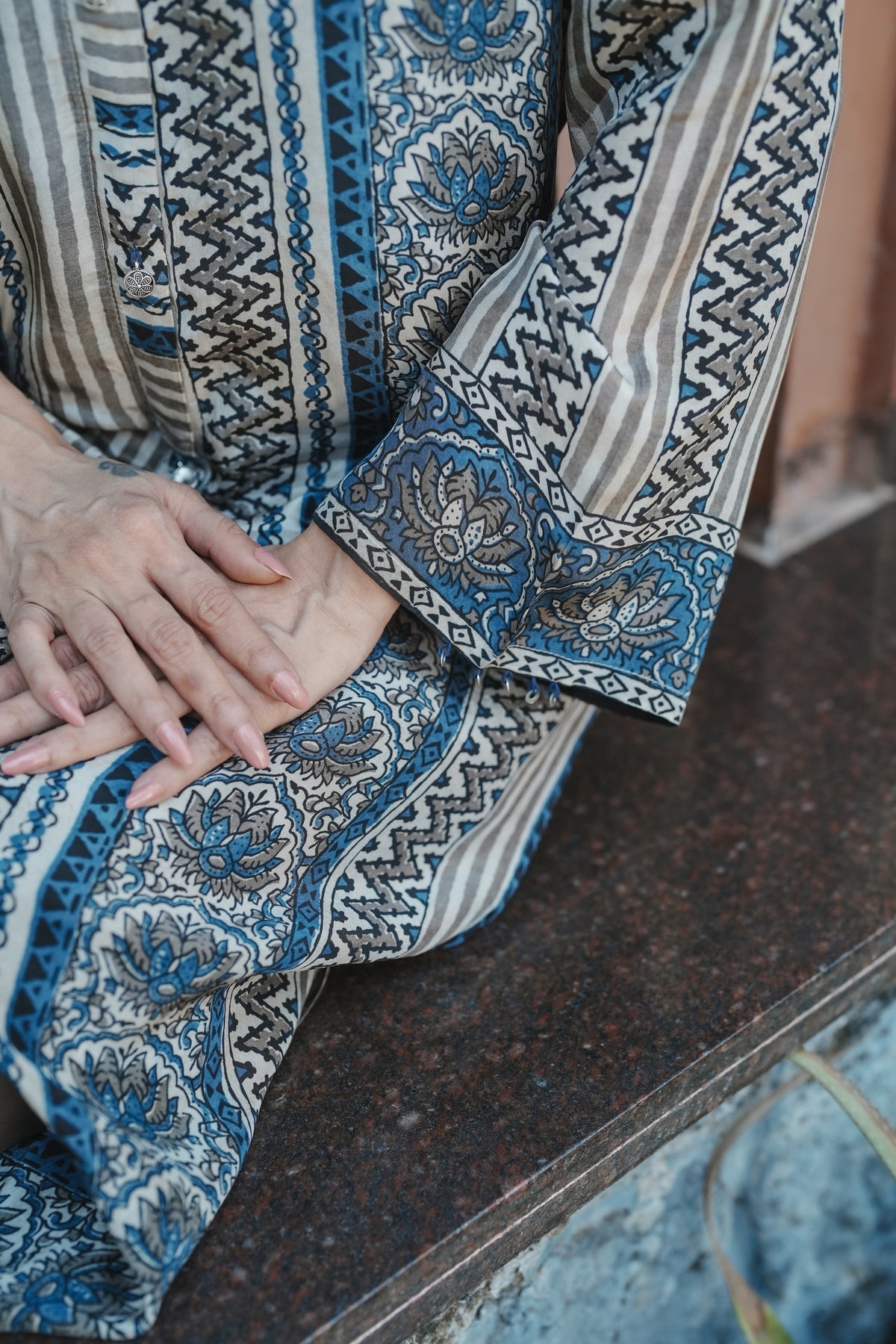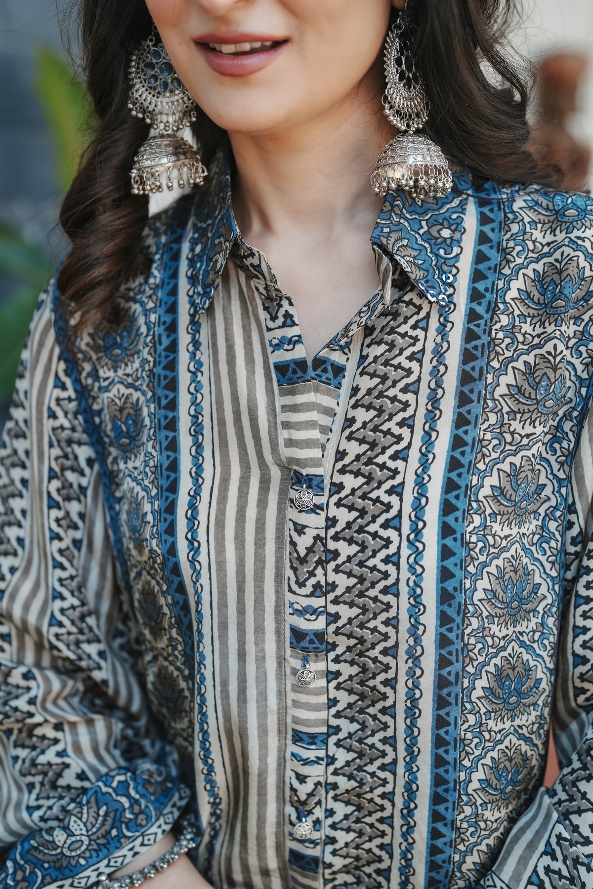 Rooted in the centuries-old Ajrakh craft tradition, this indigo and grey set brings together intricate geometric and paisley patterns in a beautifully layered design. The rich interplay of zigzag, chevron, and medallion motifs creates a striking visual depth that celebrates India's textile heritage.