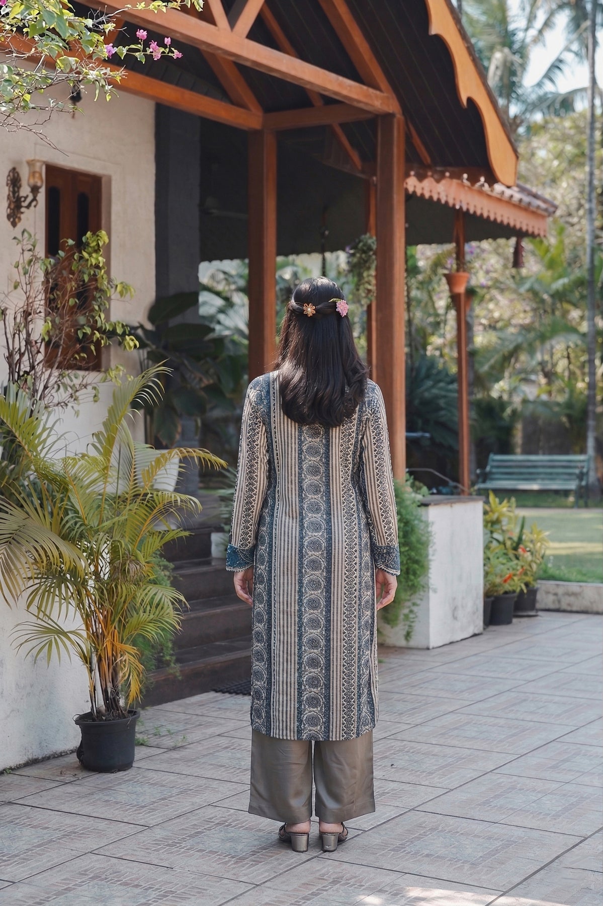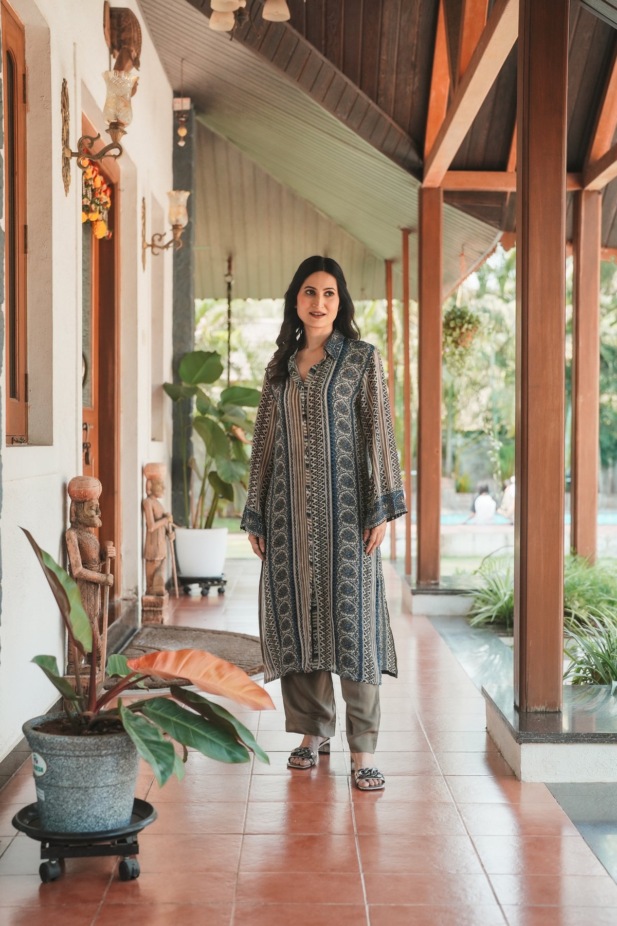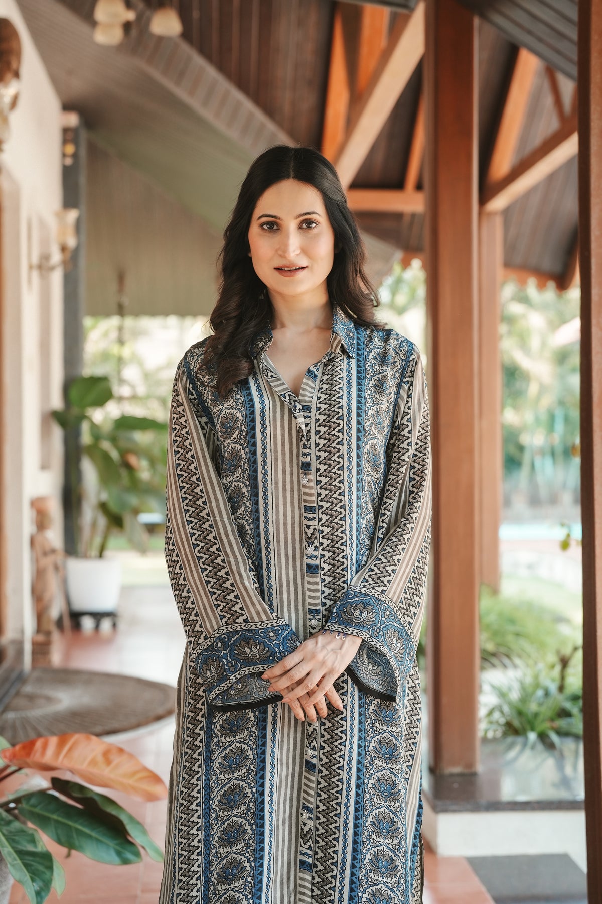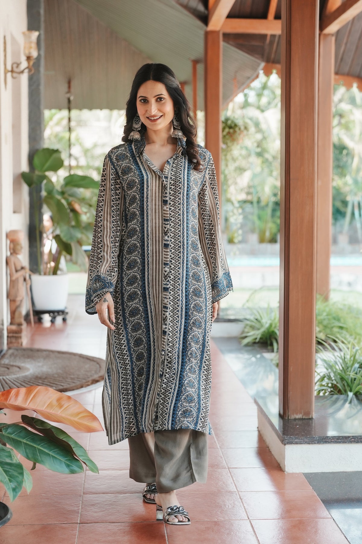 Rooted in the centuries-old Ajrakh craft tradition, this indigo and grey set brings together intricate geometric and paisley patterns in a beautifully layered design. The rich interplay of zigzag, chevron, and medallion motifs creates a striking visual depth that celebrates India's textile heritage.