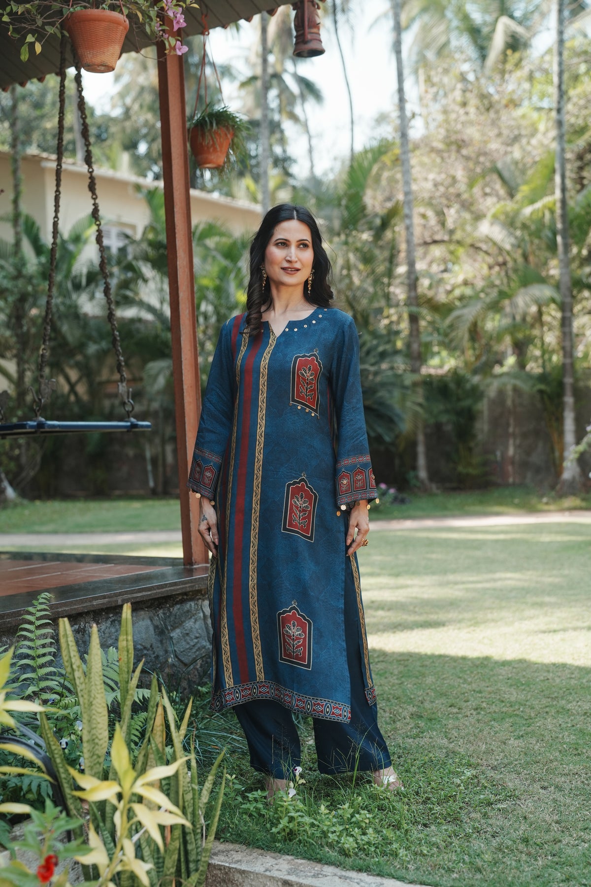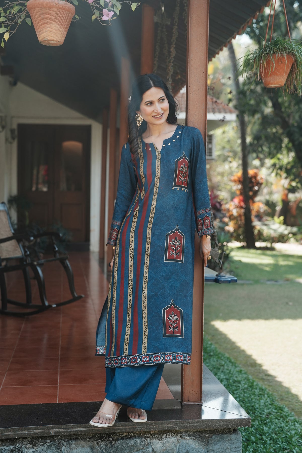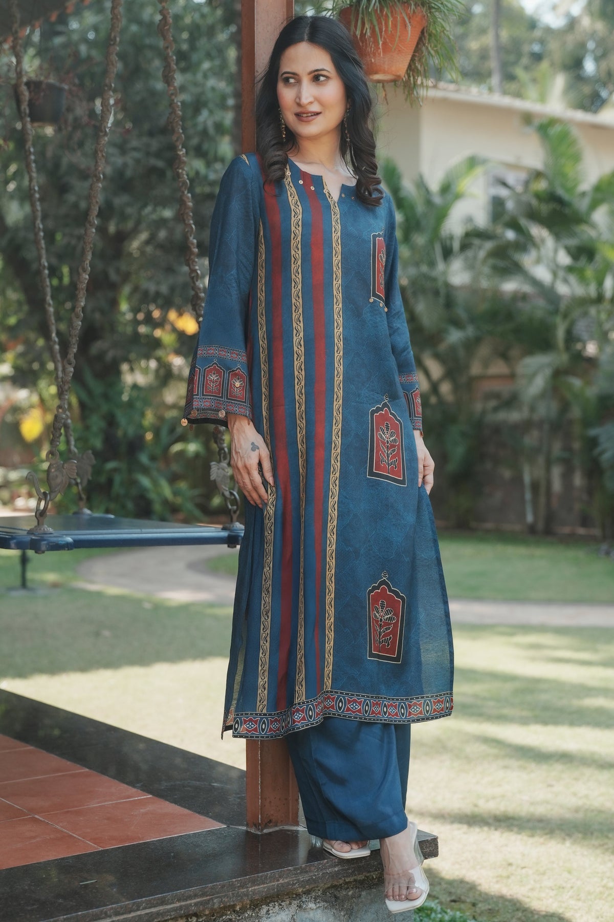 Step into timeless elegance with this teal blue straight kurta set featuring traditional Jharokha (window arch) floral motifs in rich maroon and cream. Inspired by Rajasthani architectural artistry, each motif is framed within an ornate arch, evoking the grandeur of heritage havelis.