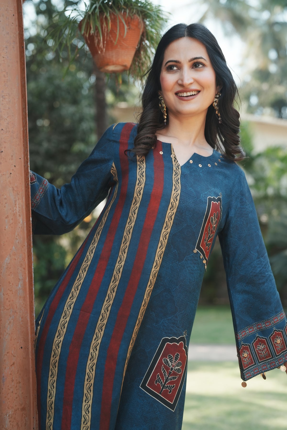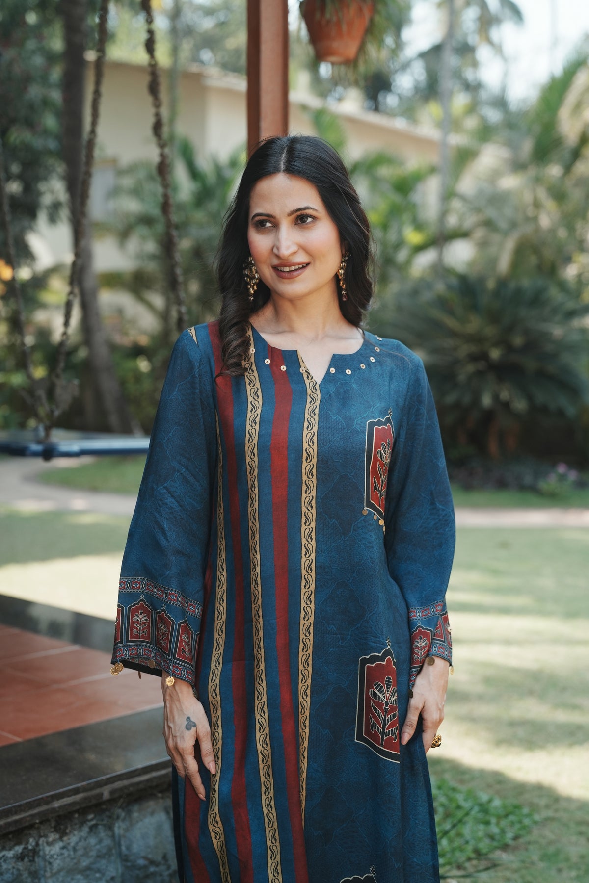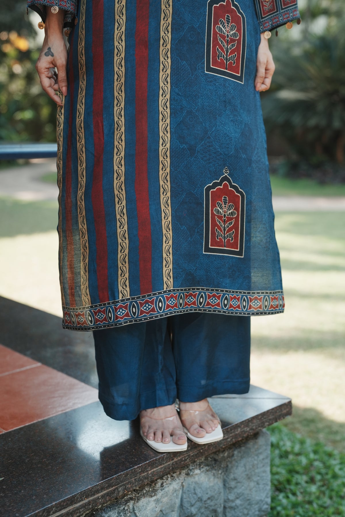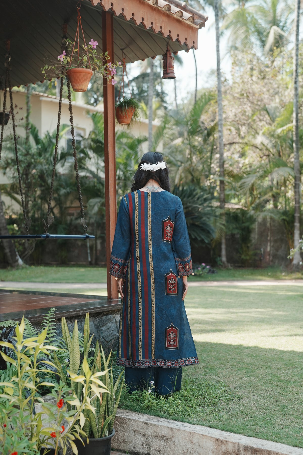 Step into timeless elegance with this teal blue straight kurta set featuring traditional Jharokha (window arch) floral motifs in rich maroon and cream. Inspired by Rajasthani architectural artistry, each motif is framed within an ornate arch, evoking the grandeur of heritage havelis.
