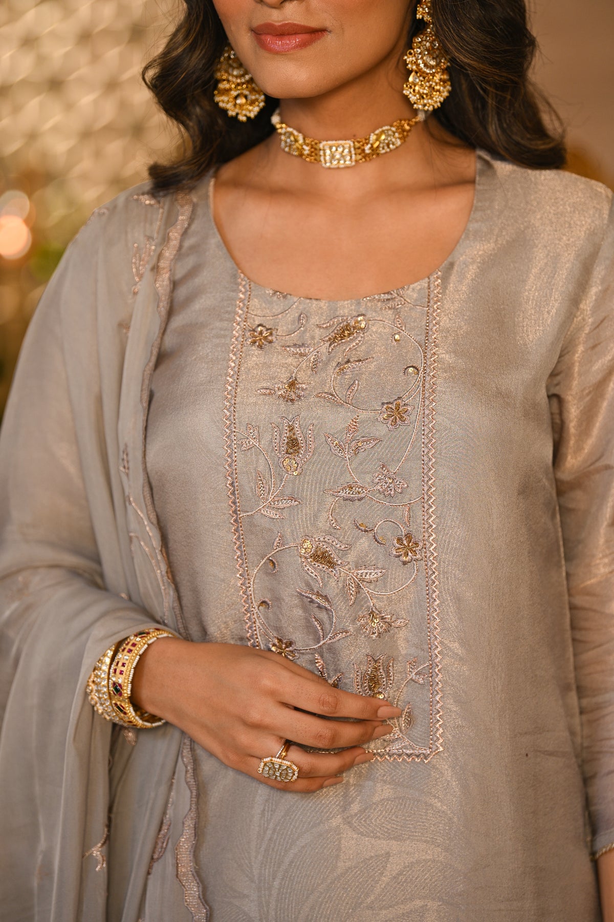 Grey Premium Pure Muslin Silk Jacquard with Hand Embroidery, With Scallop Dupatta Suit Set
