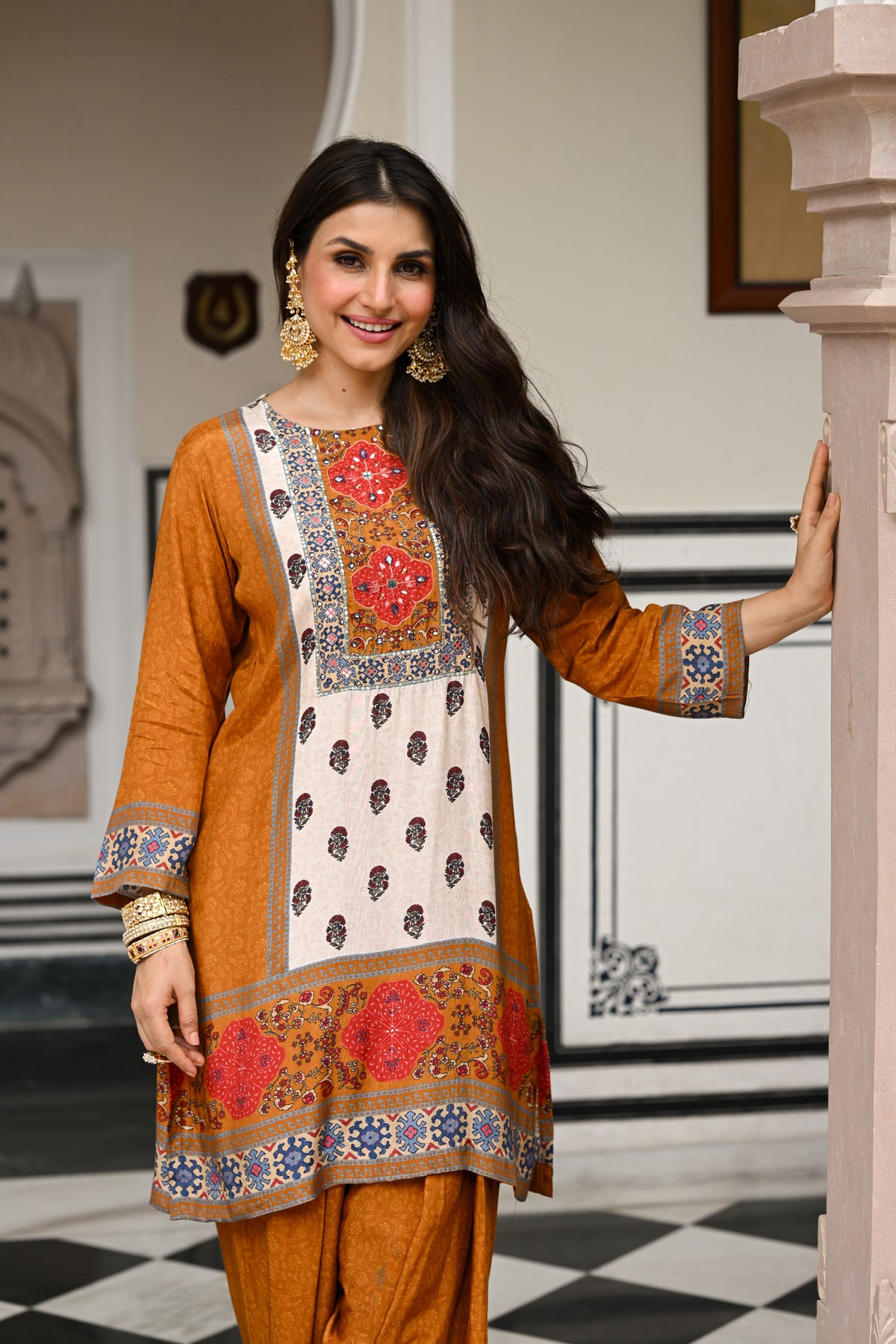 Mustard and Red Block Print Panel Placement Farsi Pant Kurta Set