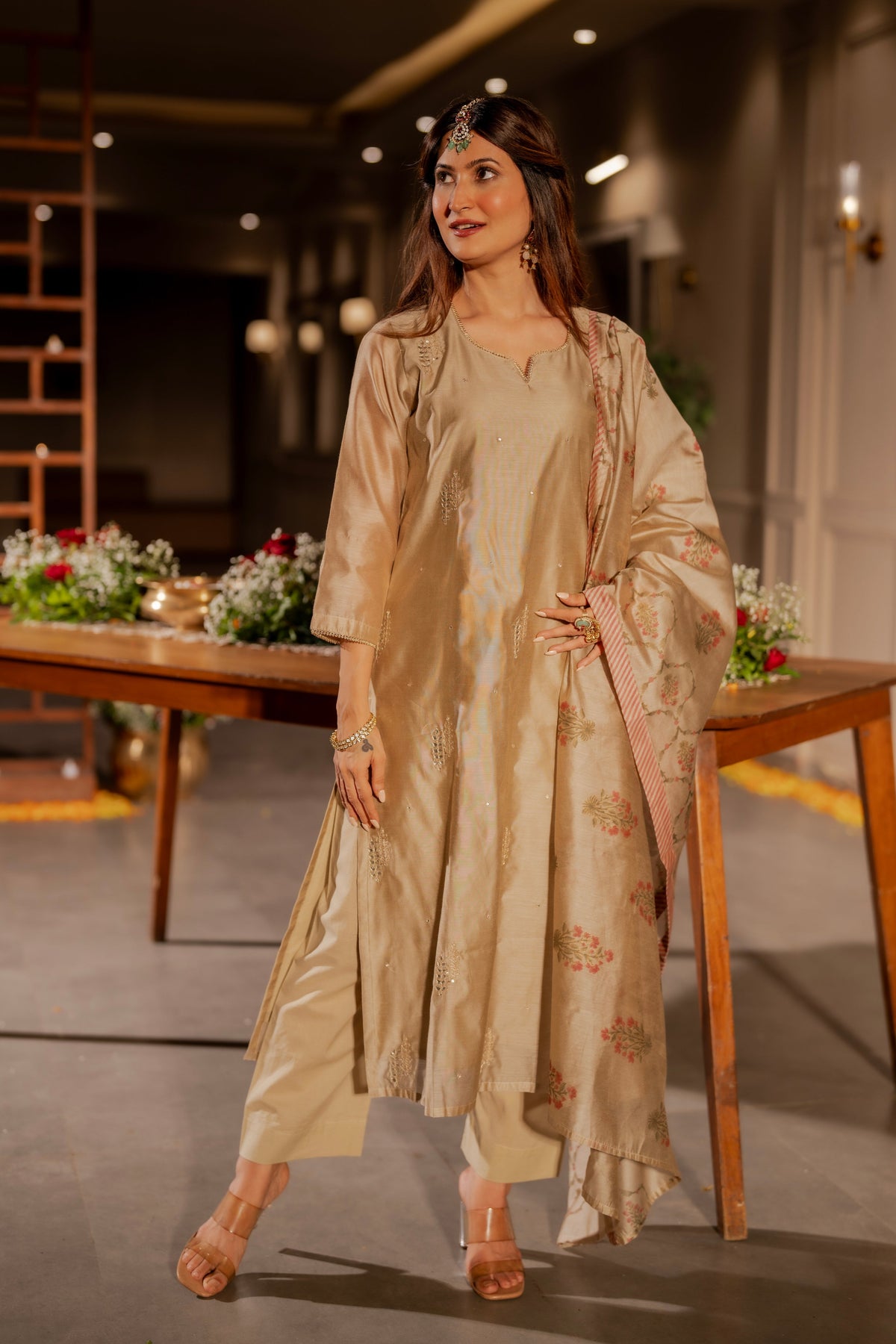 Beige Chanderi with Spread Buti Gota Work and Block Printed Dupatta