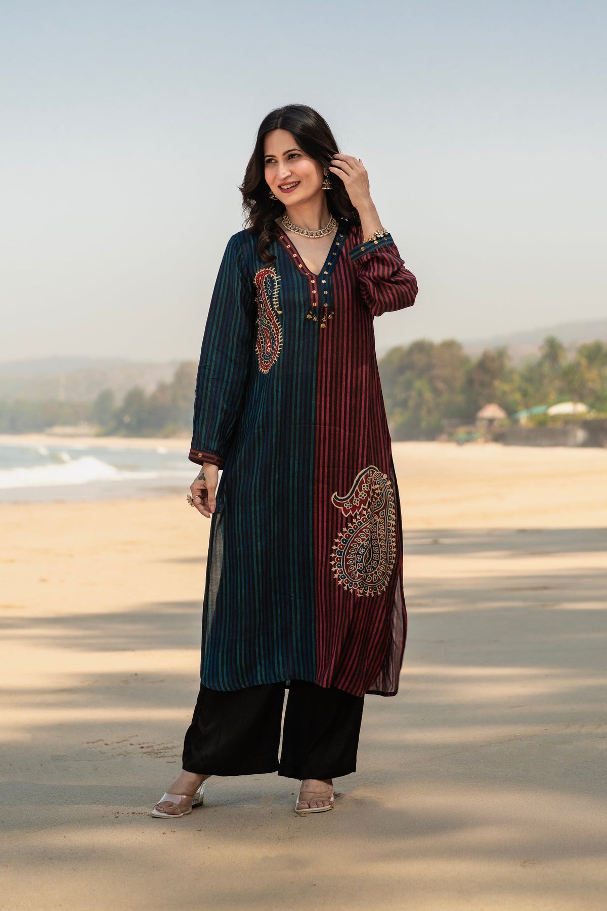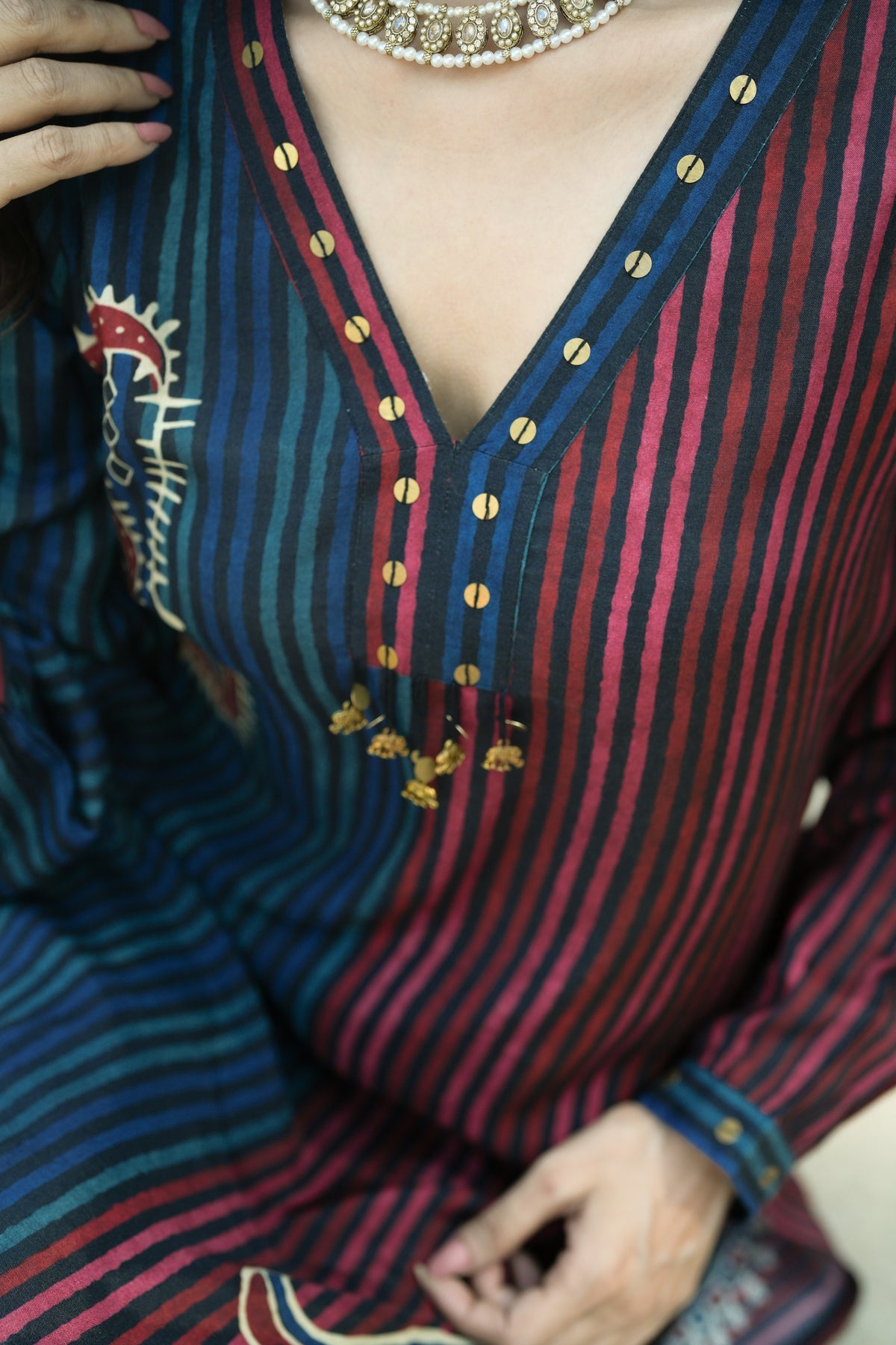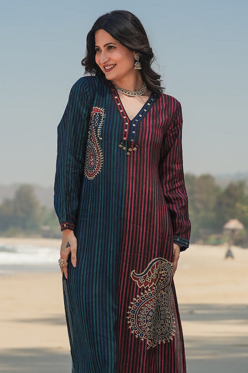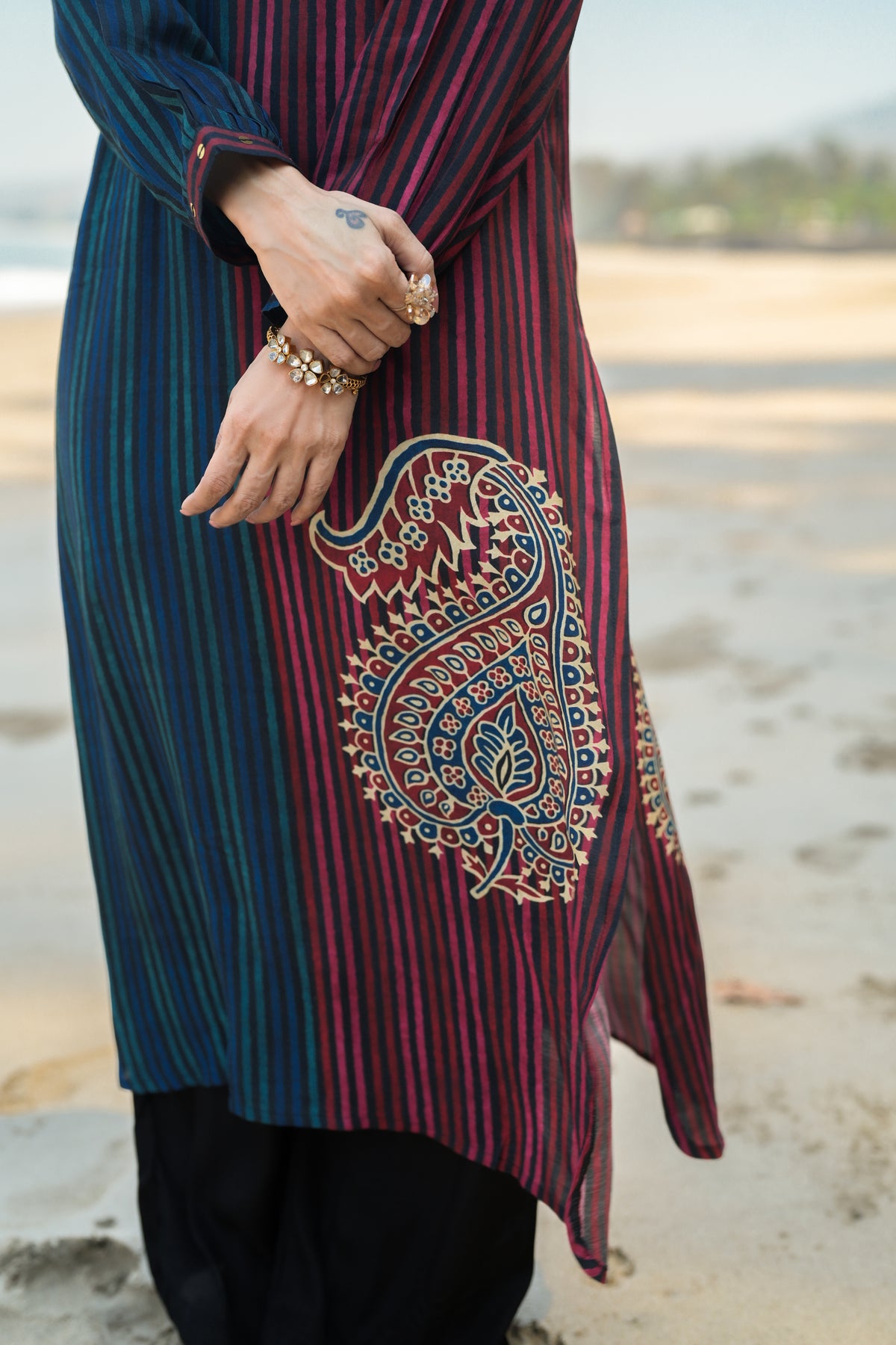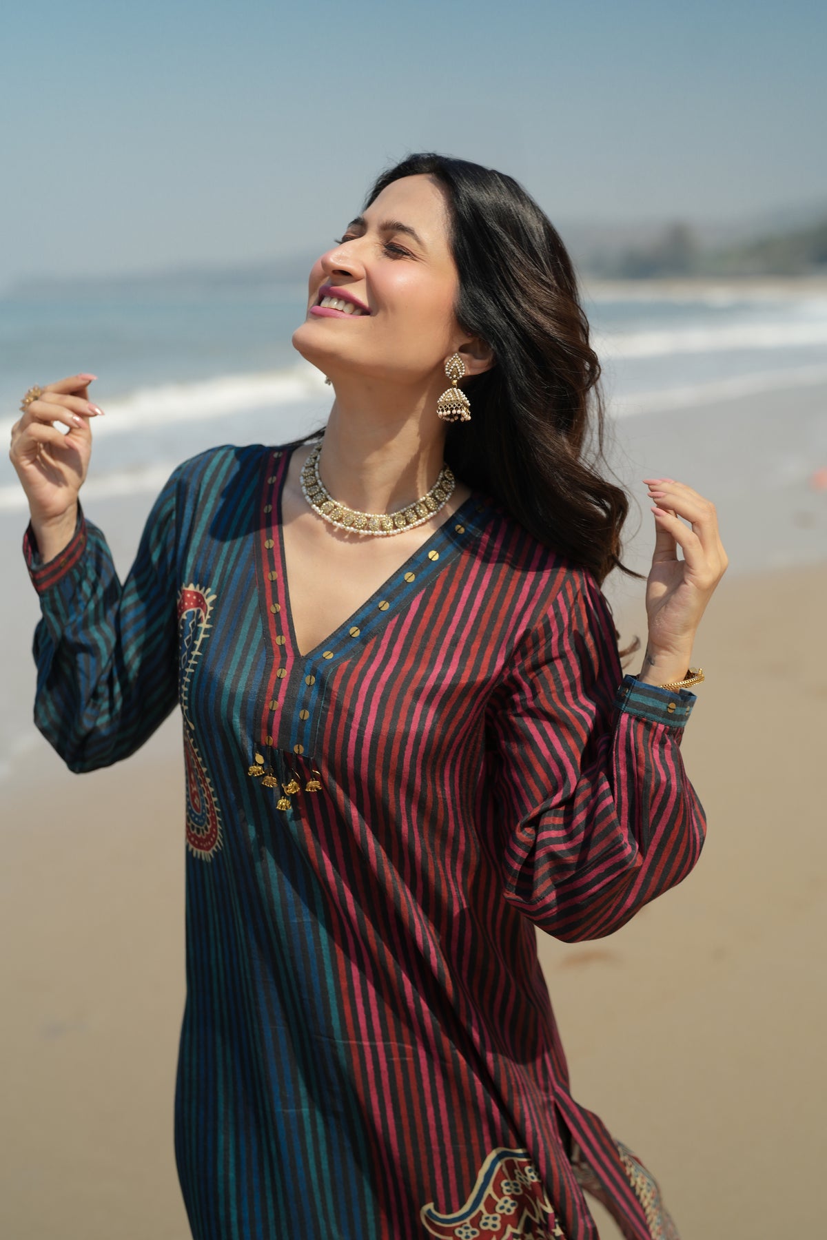Blue and red Paisley Lining Print Muslin Kurta Set