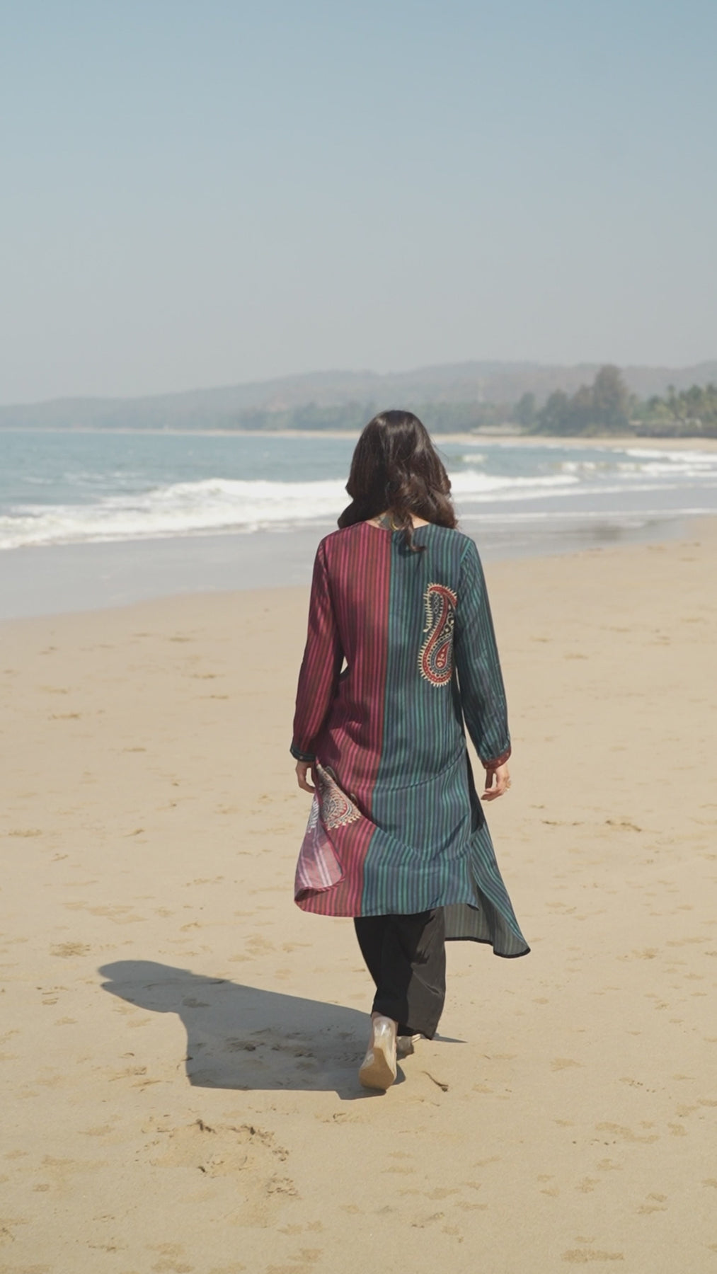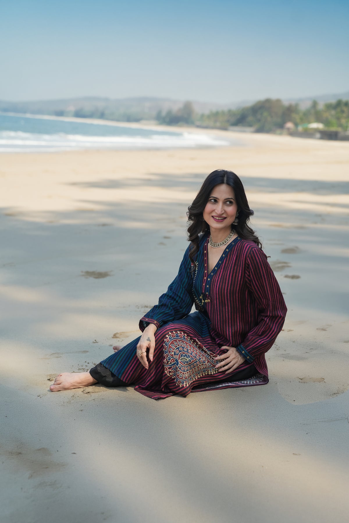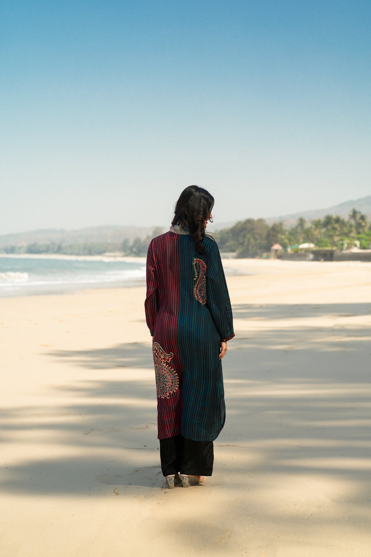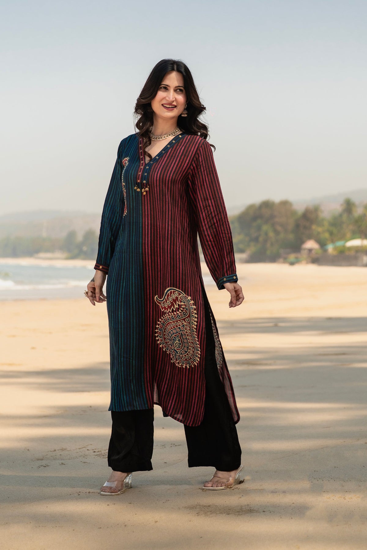 Blue and red Paisley Lining Print Muslin Kurta Set