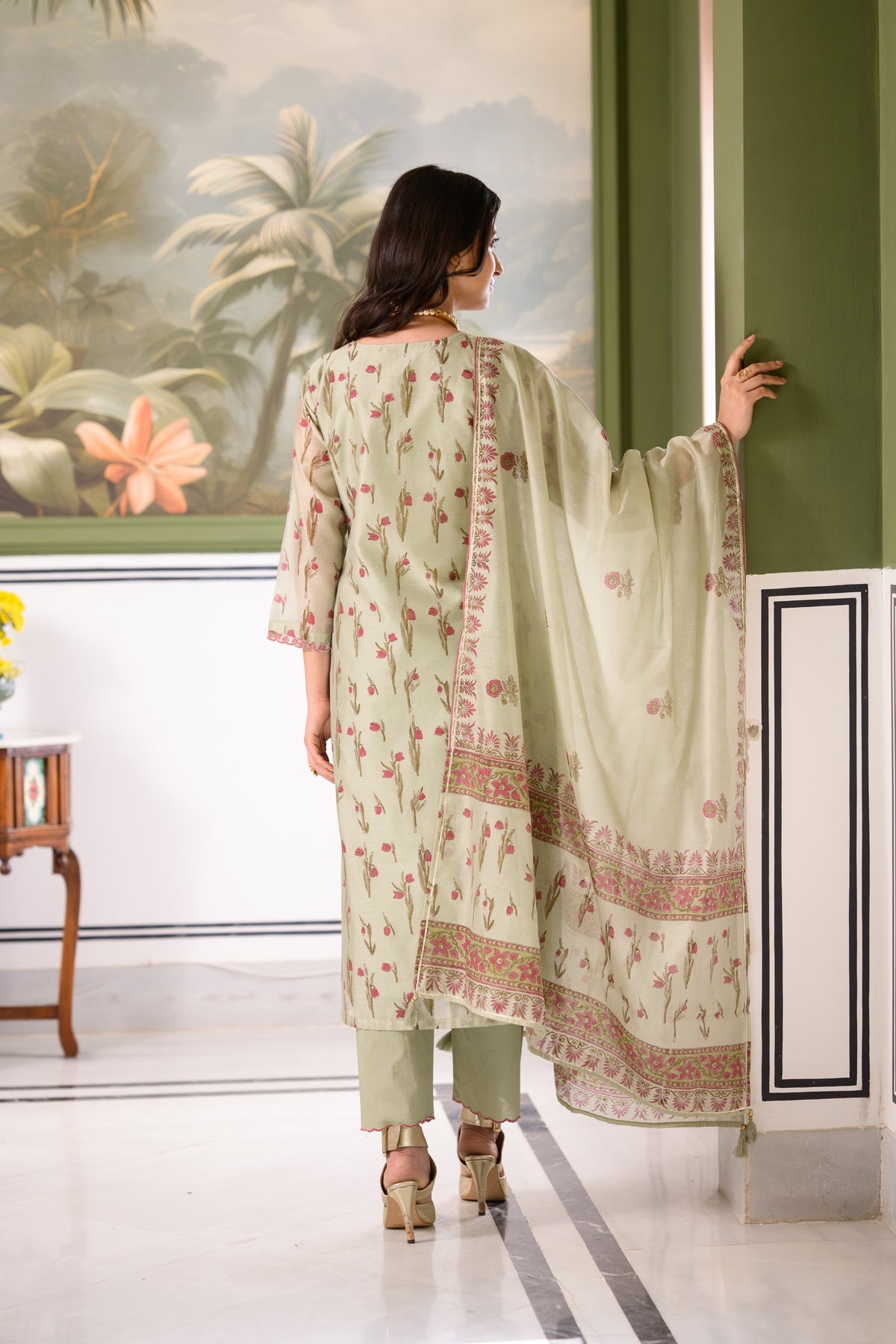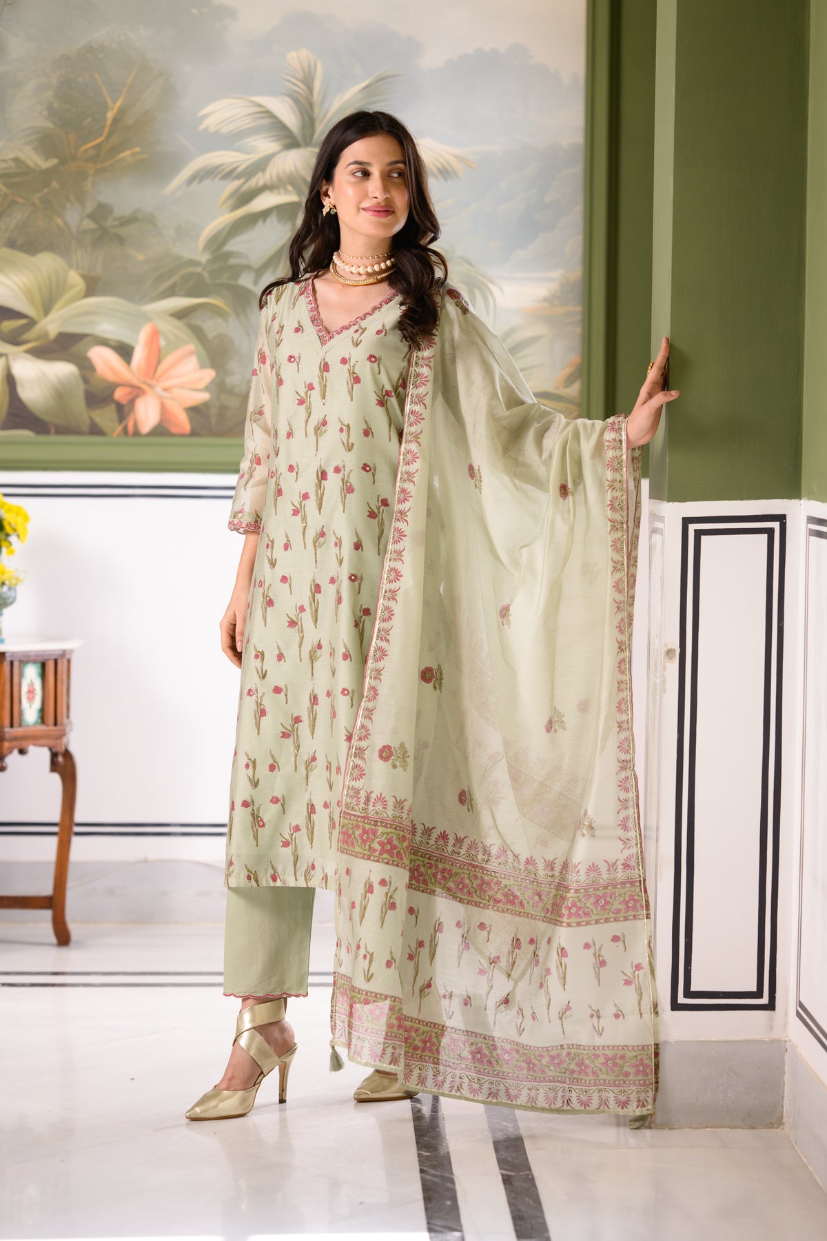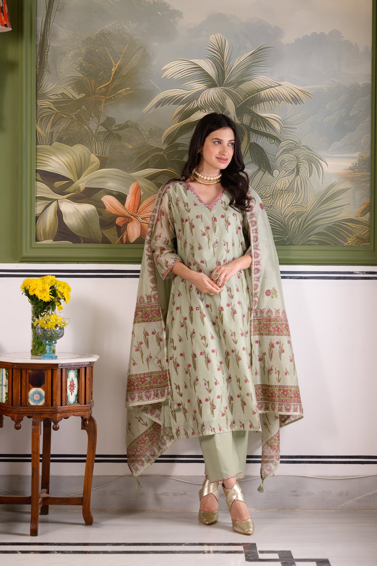 Green Daisy Suit Set with thread scallope Work in Neck and Pant