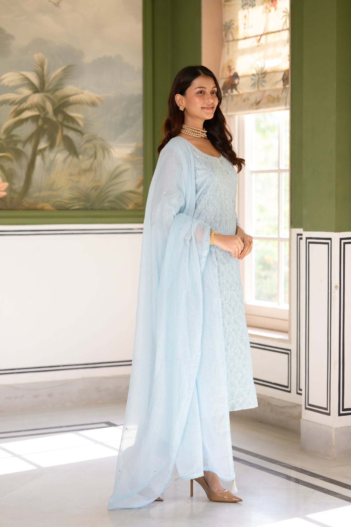 Ice Blue thread Work Chanderi Suit Set with Kota Doriya Dupatta