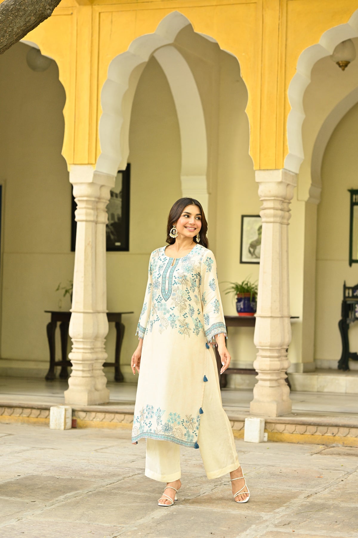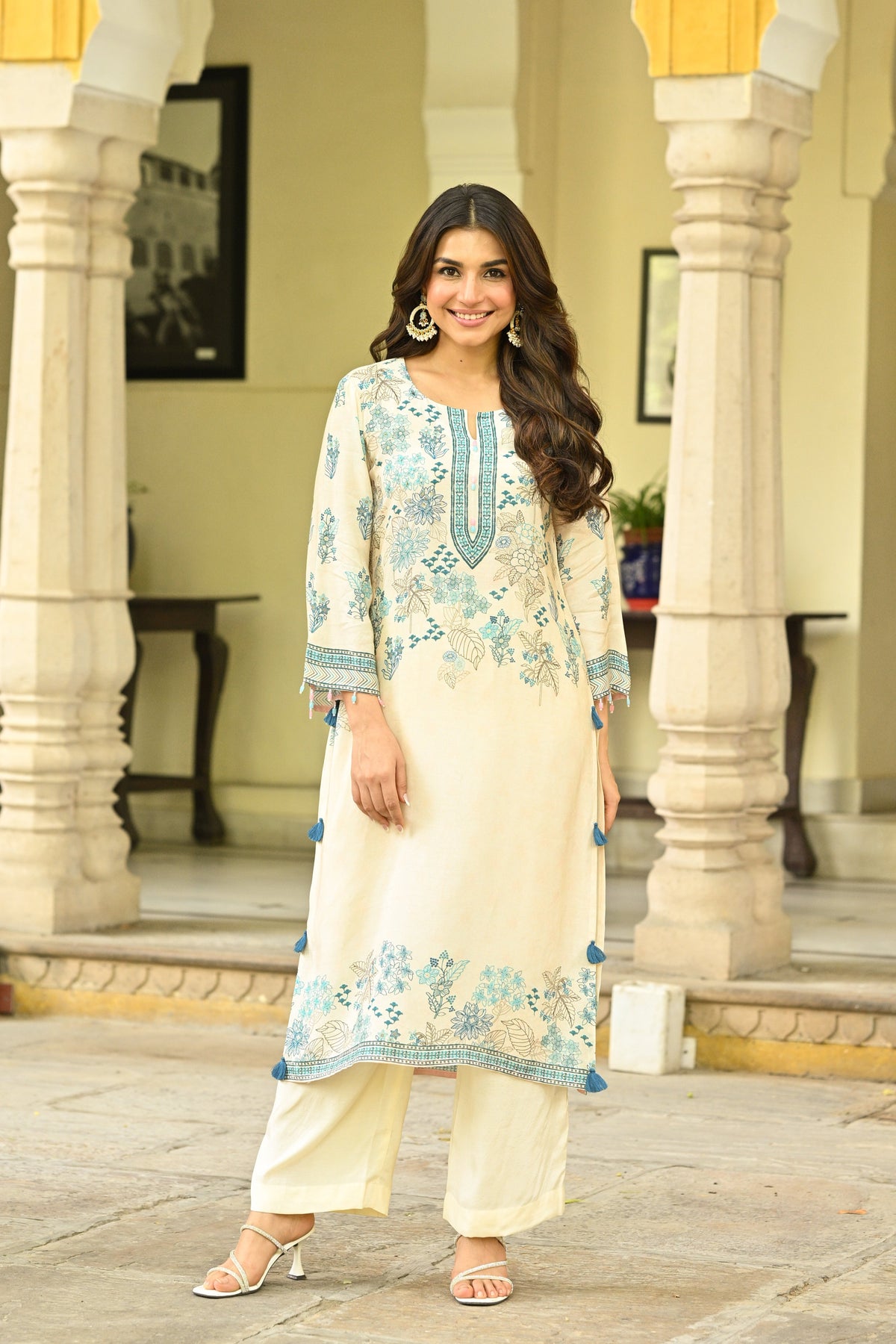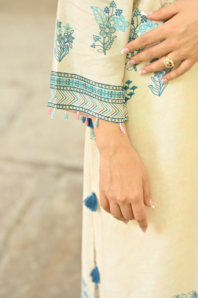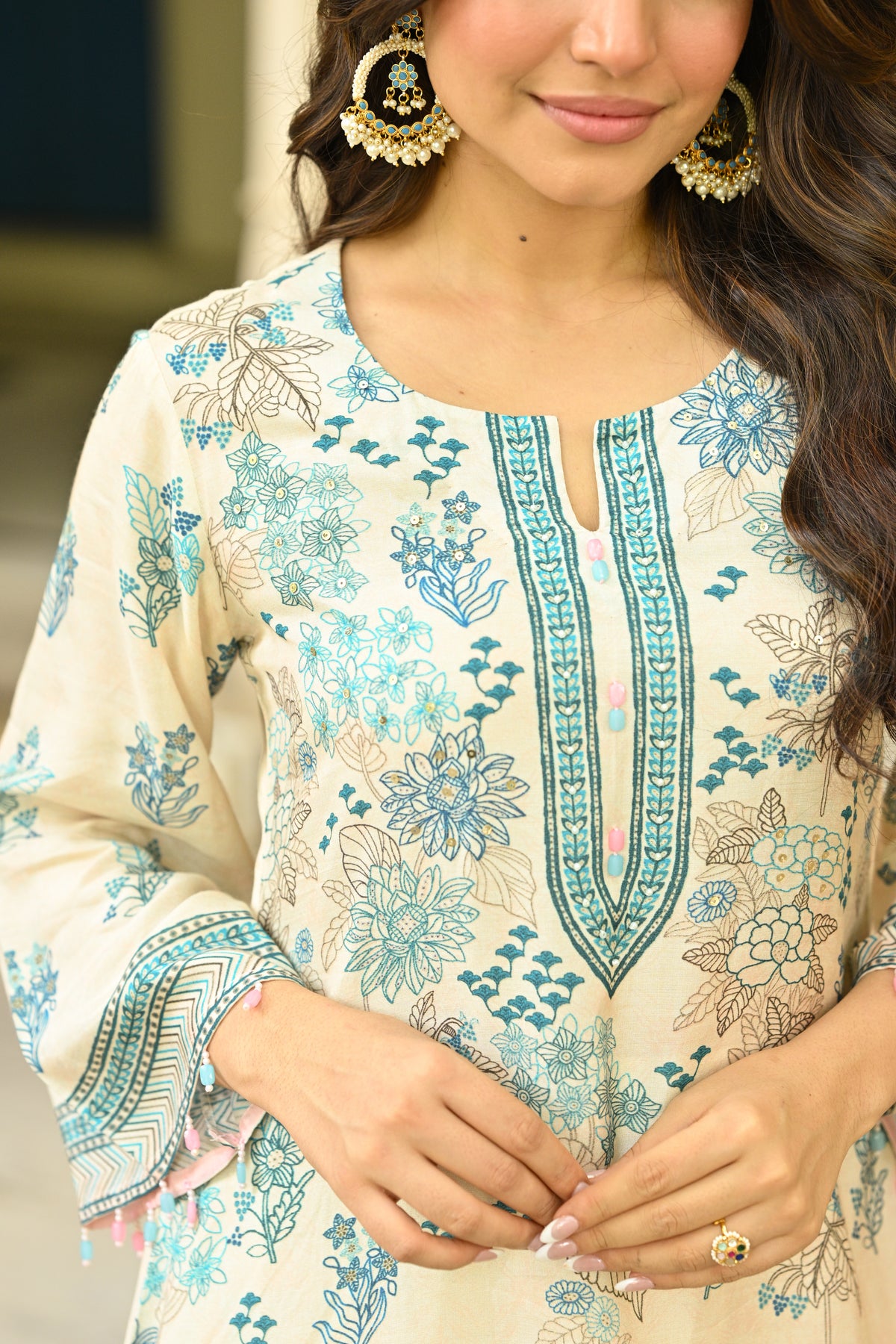 Off White and Aqua Floral Print with Tassels Placement Kurta Set