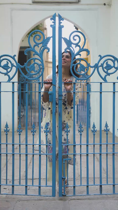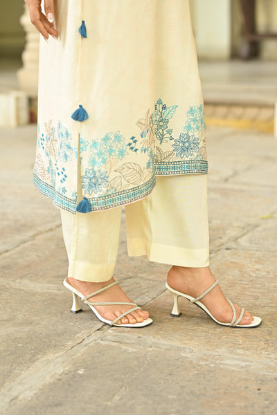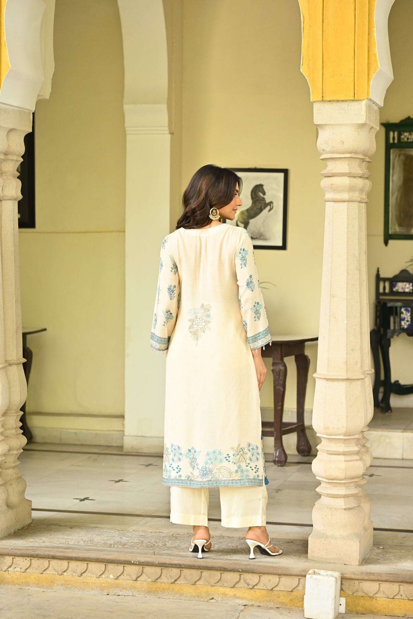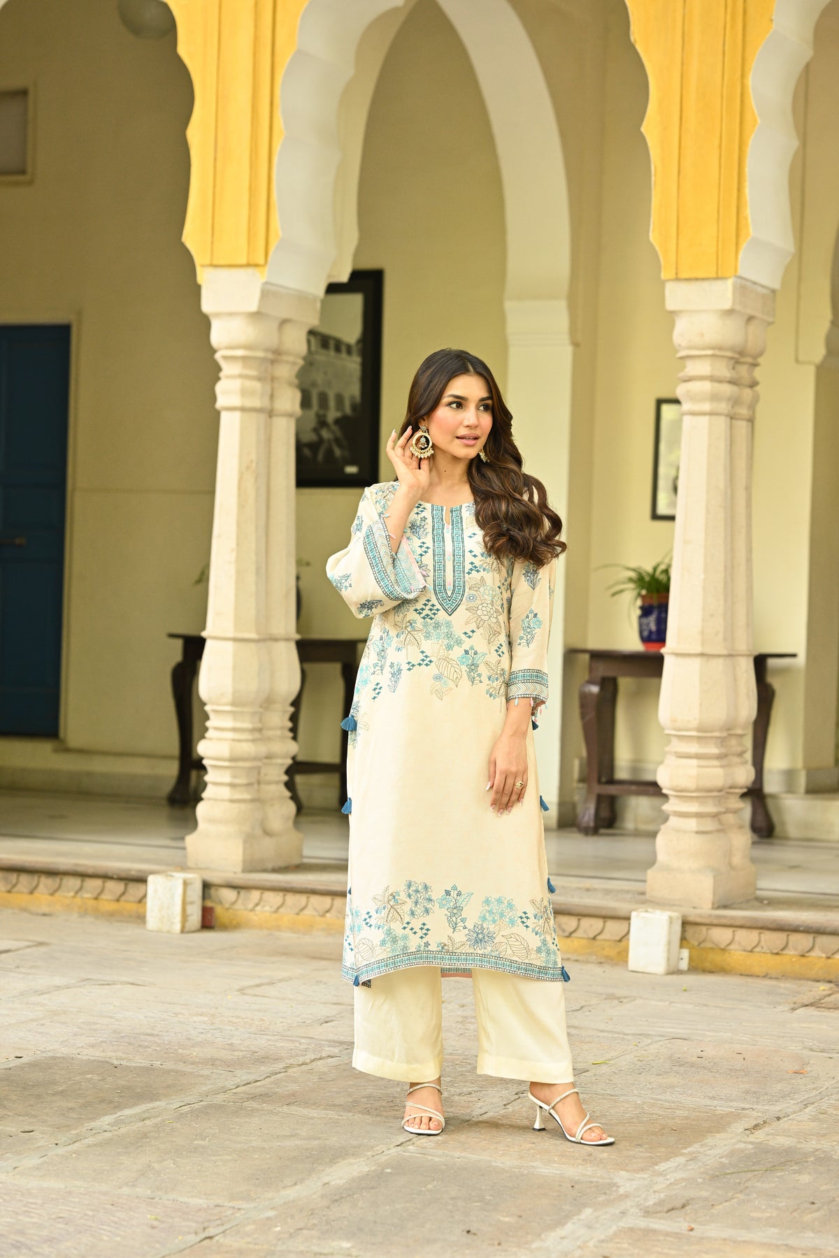 Off White and Aqua Floral Print with Tassels Placement Kurta Set