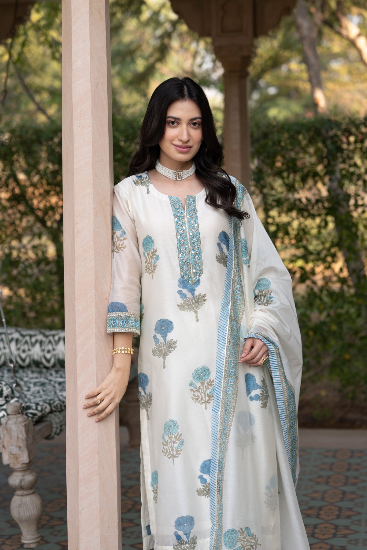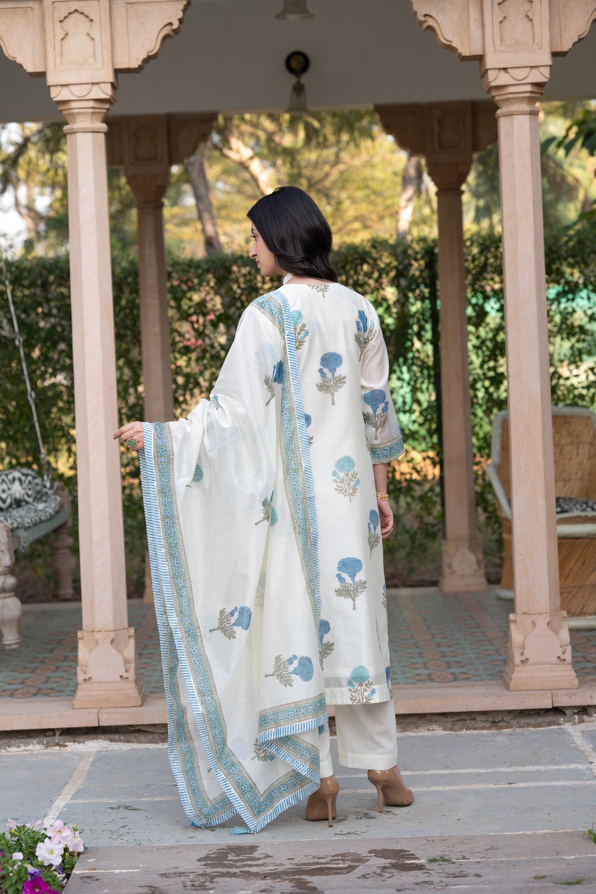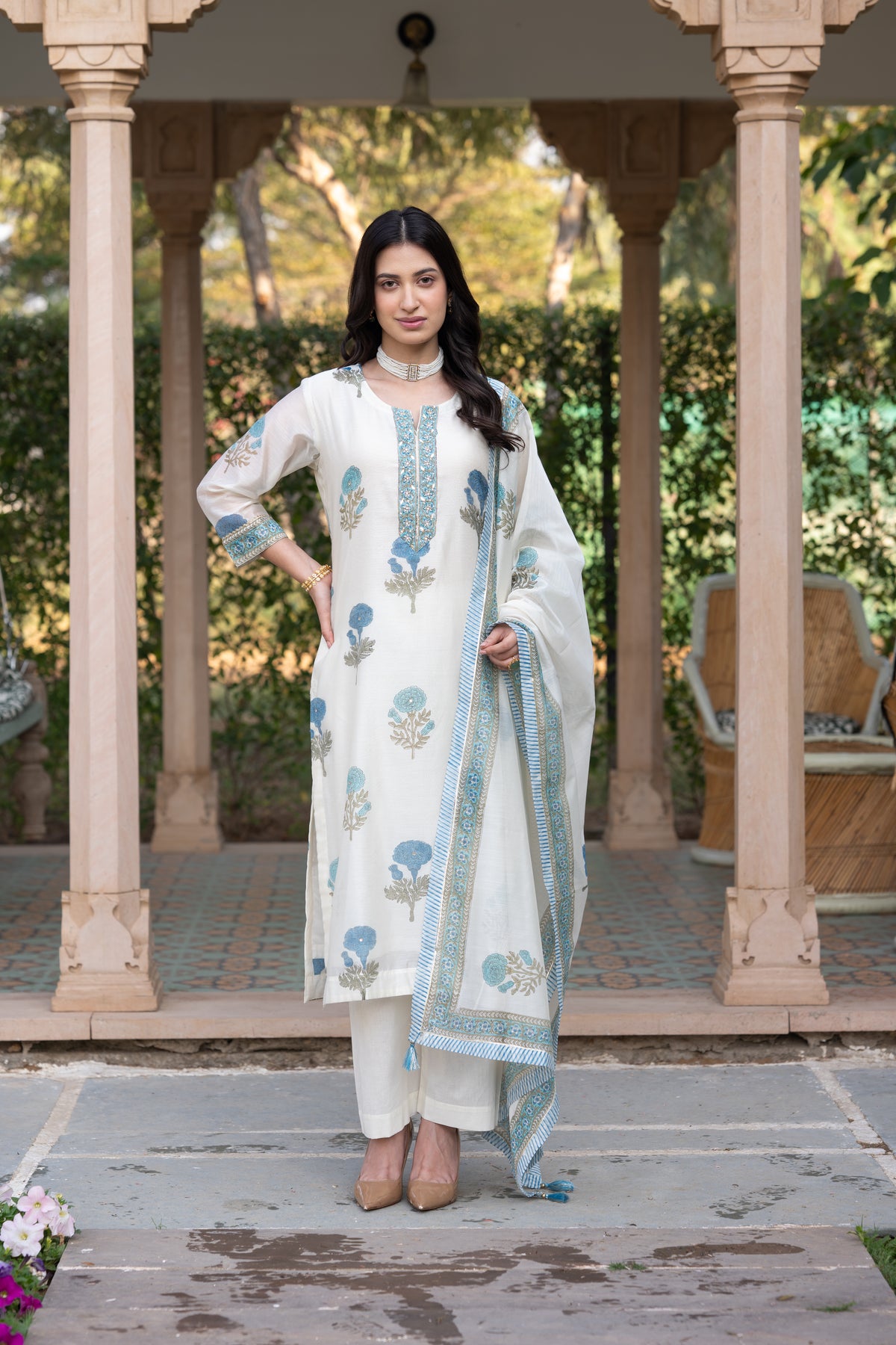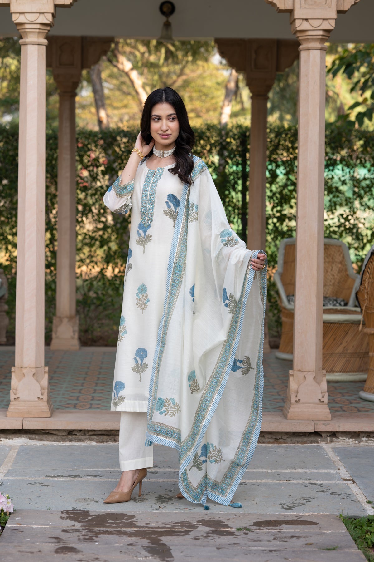 Off white with blue Mughal block print chanderi suit