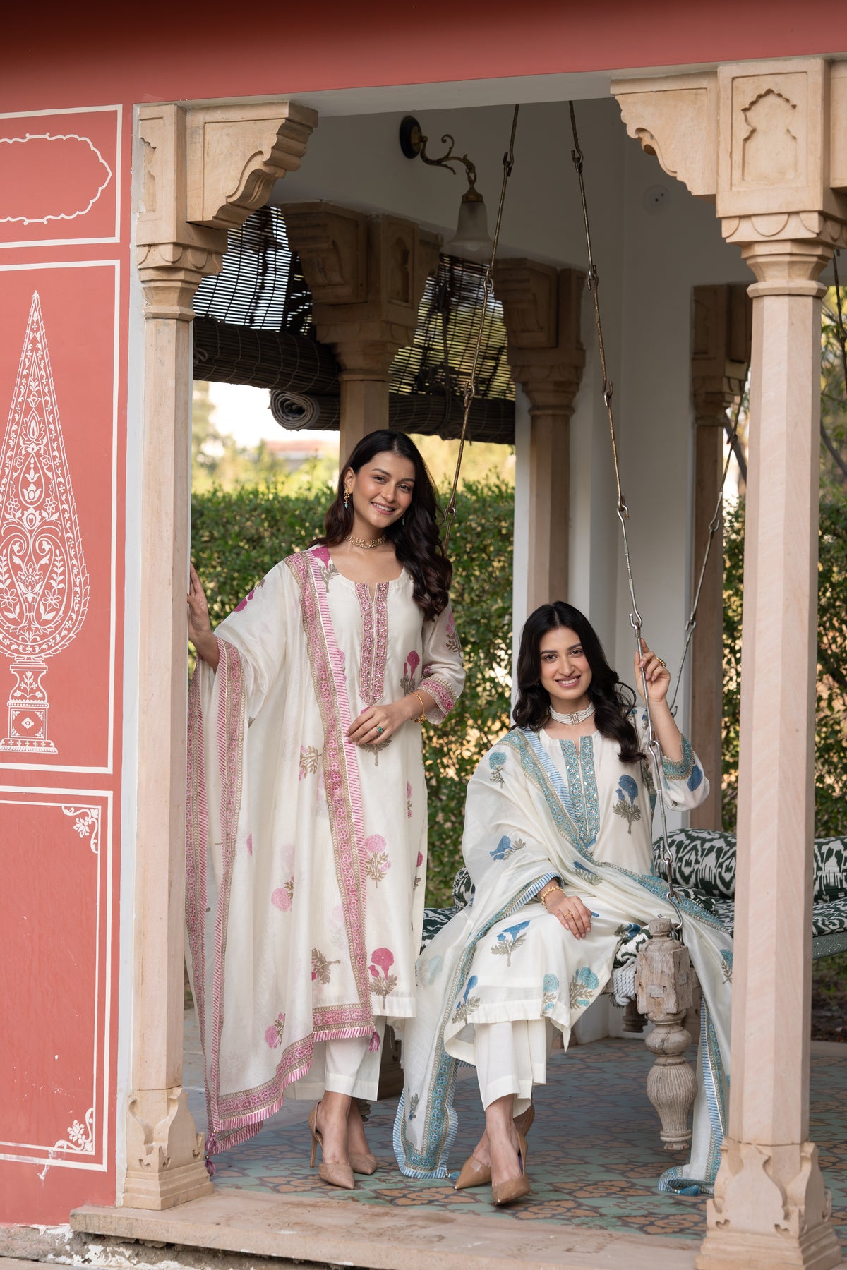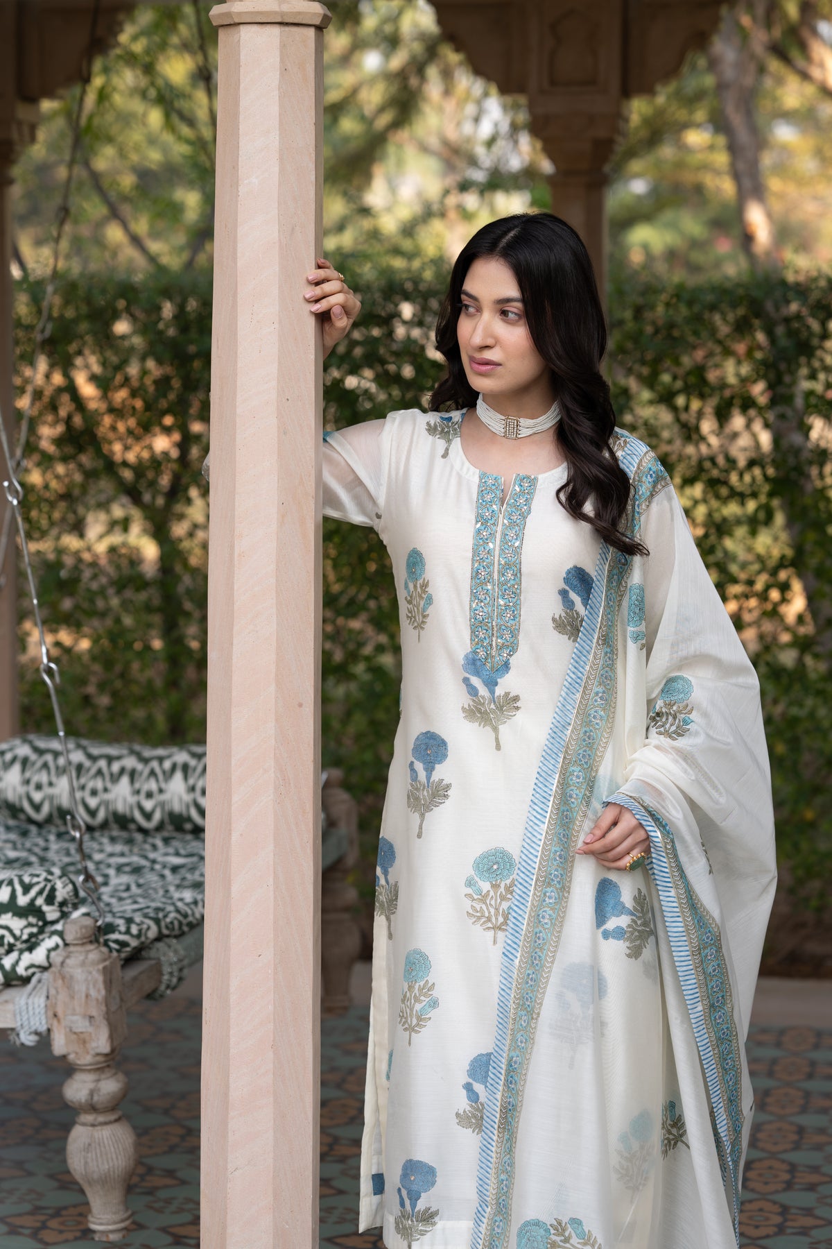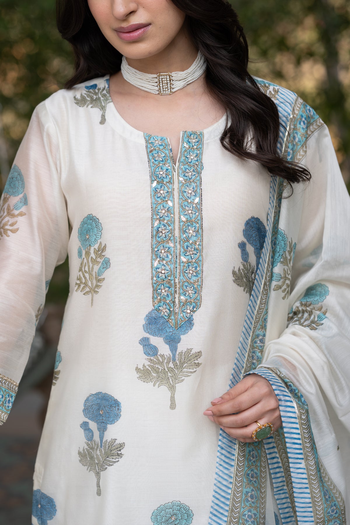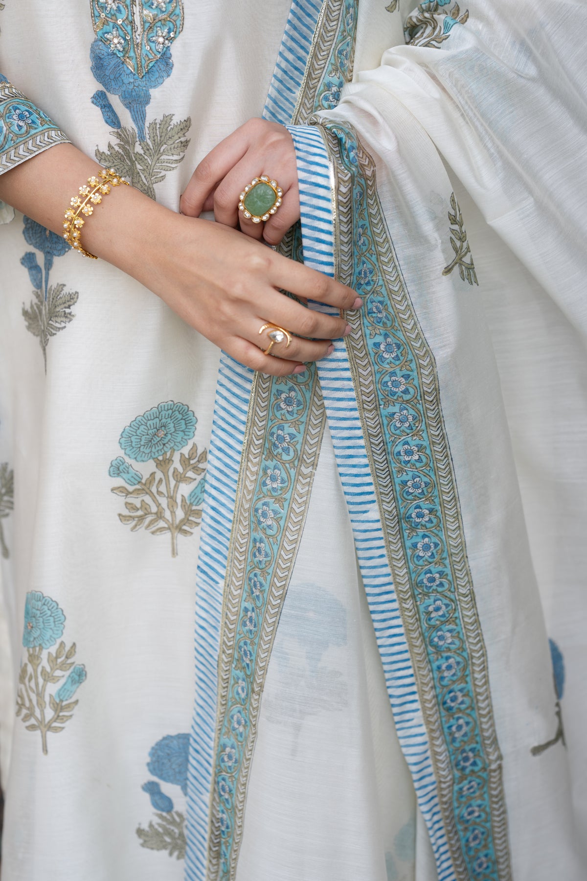 Off white with blue Mughal block print chanderi suit