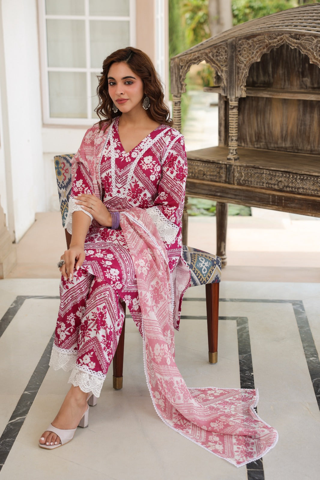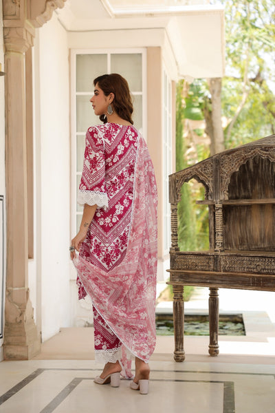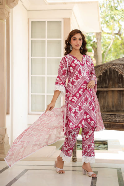 Pure mul cotton pink panel print suit set with pure soft organza dupatta